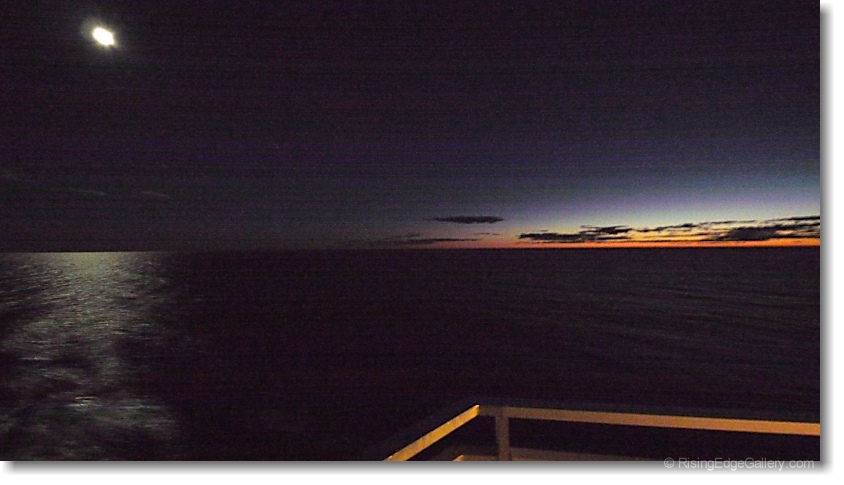 The moon over the black flowing waters was beautiful.
