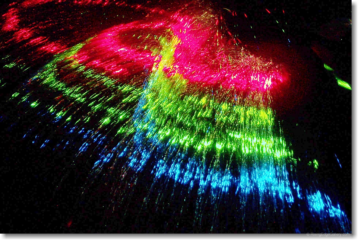 Krypton laser in multi-colour mode, spread into sheets hitting a spray of cooling water. |