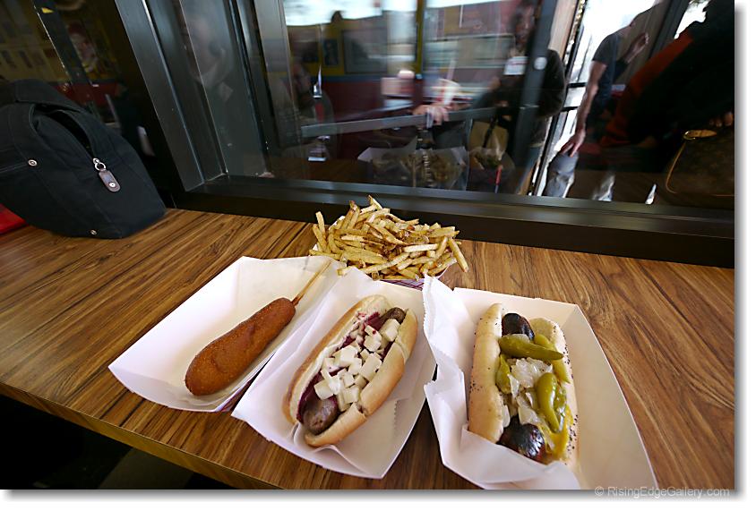 corn dog, kangaroo meat, and Polish hot dogs with french fries made in duck fat.