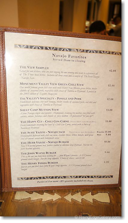 A menu page at Monument Valley restaurant/